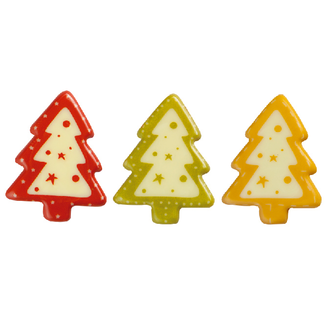 White chocolate tree decoration in three colours; green, yellow and red.
